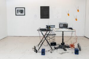 The installation evoked the setup of a basic radio transmission, inviting visitors to listen to recorded versions of these scores in the gallery. The live broadcast signal carried beyond the walls, allowing the transmission to be received on radios both inside and outside Selva Gallery on 106.01 FM.